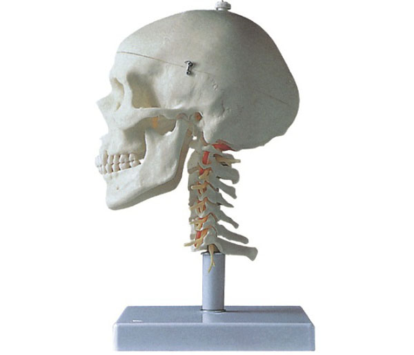 ■ 功能:模型正常人體頭顱骨帶7節(jié)頸椎、椎動(dòng)脈、脊神經(jīng)串制而成,顱蓋可打開,下頜骨可靈活活動(dòng),示顱骨和頸椎的組成和形態(tài)結(jié)構(gòu);