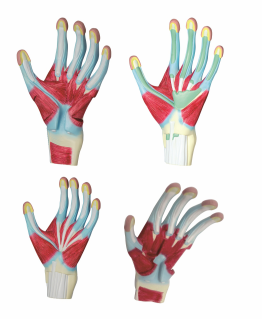 ■ 功能:模型一套四只,在腕掌側(cè)韌帶上方水平橫切,分別由淺入深層層解剖。主要顯示手背和手掌部的肌肉、肌腱及橈、尺側(cè)囊。在手掌側(cè),可示外側(cè)、中間和內(nèi)側(cè)三群,模型還顯示前臂肌肉的肌腱達(dá)手背、手掌部的止點(diǎn);