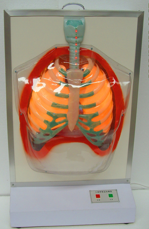 ■ 功能:模型根據(jù)解剖學原理制作,由透明的塑料人體外部形態(tài)和PVC塑料肋骨、胸骨、膈肌等內(nèi)部結(jié)構(gòu)構(gòu)成;模型是由力學機械和同步電子電路程序控制組合成,能動態(tài)模擬呼吸運動。