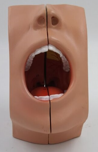 ■ 功能:模型至頸上部在舌骨高度作水平切。主要顯示口腔,消化管的起始部??谇坏那氨诤蛡?cè)壁由上、下唇和頰組成,經(jīng)口裂與外界相通,口腔借牙弓(牙槽突、牙齦、牙列)分成前后二部,前外側(cè)部顯示口腔前庭,后內(nèi)側(cè)部顯示固有口腔,其前界及外側(cè)界為牙弓,向后借口咽峽與咽交通,其上壁的前部為硬腭,后部為軟腭。模型還顯示上、下恒牙的牙冠、扁桃體上隱窩、口咽峽、舌扁桃體、舌體、咽腭弓、腭扁桃體、舌腭弓、腭垂、腭大動脈、腭舌肌及口唇等;