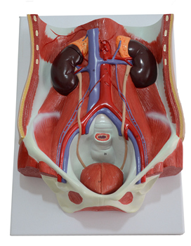 ■ 功能:該模型顯示了腎臟,輸尿管,膀胱以及子宮等結(jié)構(gòu),其中右腎打開顯示腎內(nèi)部結(jié)構(gòu),膀胱和子宮可打開示矢狀切面,腹后壁等血管,肌肉結(jié)構(gòu);