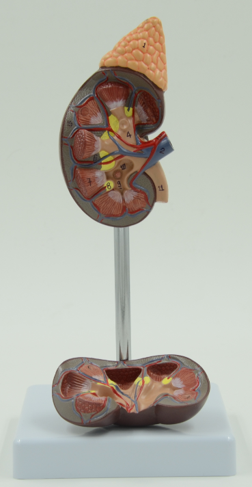 ■ 功能:顯示腎上腺的腎的真人大小的模型。模型沿前平面剖切,分為兩部分顯示內(nèi)部結(jié)構(gòu),包括皮質(zhì)、髓質(zhì)、帶乳頭的錐體、部分開放的腎盂、輸尿管、血管;