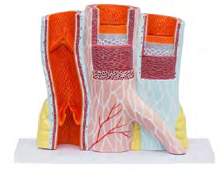 ■ 功能:動脈與靜脈比較模型,顯示動脈和靜脈的立體結(jié)構(gòu),動脈三層膜比靜脈三層膜厚,動脈有內(nèi)外彈性膜,而靜脈平滑肌及彈性組織不如動脈,靜脈內(nèi)孔比動脈內(nèi)孔大,靜脈有瓣;