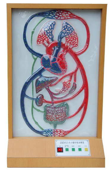 ■ 功能:該模型作大小循環(huán)電動模型的心臟作冠狀切面,顯示心臟左、右心房,左、右心室及整個心動周期內的搏動狀況與血液循環(huán)的生理機制,模型模擬人體心臟心動周期的活動,利用燈光的流動,演示血液在血管內流動的情況及體循環(huán)和肺循環(huán)的途徑,用于中小學校與大專院校講解人體解剖學課程,幫助學生了解心臟結構,心動周期與血液循環(huán)的途徑;