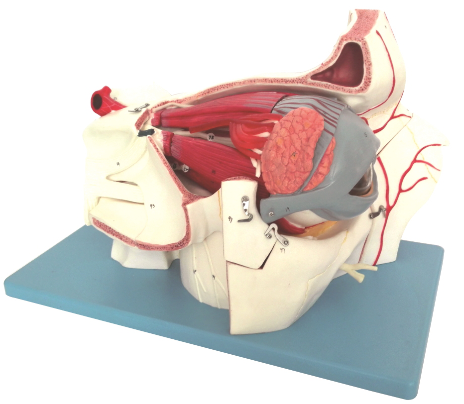 ■ 功能:模型由眼眶、眼球壁、鞏膜、脈絡膜和視網(wǎng)膜、玻璃體、眼球外肌以及眼眶壁和鼻甲10個部件組成,詳盡的展示了眼(包括眼球壁和內容物)、眼副器(包括眼瞼、結膜、淚器和眼球外?。┮约把鄣难芎蜕窠?jīng)等結構;