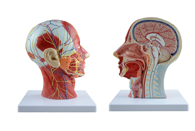 ■ 功能:模型顯示了人類頭部和頸部的右半部分,沿著垂直面剖切。淺層解剖暴露面部肌肉、面部和頭皮的淺層血管和神經(jīng)分支、腮腺和頜下腺。正中解剖暴露了大腦及其內(nèi)部結(jié)構(gòu),咽和上呼吸道,頸椎的一部分;
