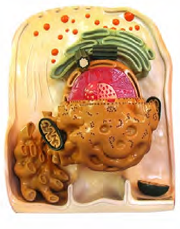 ■ 功能:本模型系立方形半模式細(xì)胞立體的超微結(jié)構(gòu)。細(xì)胞三面除去細(xì)胞膜,切開核的1/4部分。暴露各種細(xì)胞及核的結(jié)構(gòu)。主要的細(xì)胞器為線粒體,粗面及滑面內(nèi)質(zhì)網(wǎng),高爾基復(fù)合體,都有整體觀和切面相配合,胞核切面顯示核膜、染色質(zhì)和核仁。其他如核糖體溶酶體,微絲、微管、分泌泡等均有分布。此外胞膜面有微絨毛及基底胞膜內(nèi)褶等結(jié)構(gòu),表現(xiàn)清楚;