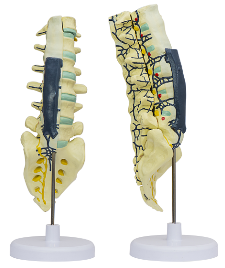 ■ 功能:顯示脊柱的腰屈和骶屈,剖開(kāi)一胸椎,示骨髓腔、骨松質(zhì)、骨密質(zhì)和椎間盤(pán)。在腰骶椎的背側(cè),顯示馬尾、終絲,同時(shí)還顯示部分腰神經(jīng),骶神經(jīng)穿椎間孔和骶前、后孔的情況及該部位的靜脈回流。顯示腰椎、骶尾椎的解剖特征和與該段脊神經(jīng)的位置關(guān)系;
