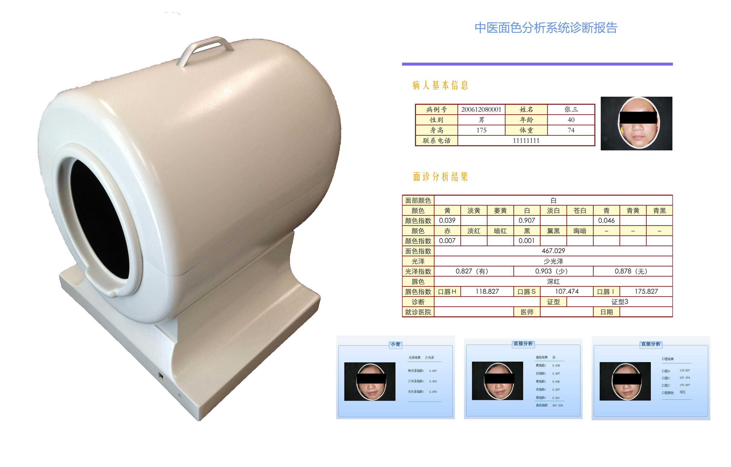 中醫(yī)面診檢測(cè)分析系統(tǒng)從模式識(shí)別的角度出發(fā),通過(guò)對(duì)病人面部圖像進(jìn)行分割,得到面部顏色、光澤和口唇定性定量分析結(jié)果,結(jié)合醫(yī)生專業(yè)診斷,給出專業(yè)診斷結(jié)果并打印成報(bào)告。該系統(tǒng)能達(dá)到輔助中醫(yī)臨床診斷的作用。從數(shù)據(jù)庫(kù)中讀取面診信息數(shù)據(jù),建立和編輯病例,并對(duì)面部圖線顏色、光澤和口唇進(jìn)行分析和判讀,建立中醫(yī)診斷報(bào)告。中醫(yī)舌象分析儀已在上海龍華醫(yī)院、上海曙光醫(yī)院試用,采集并分析了幾千例舌圖像,分析結(jié)果與臨床診斷符合率較高。