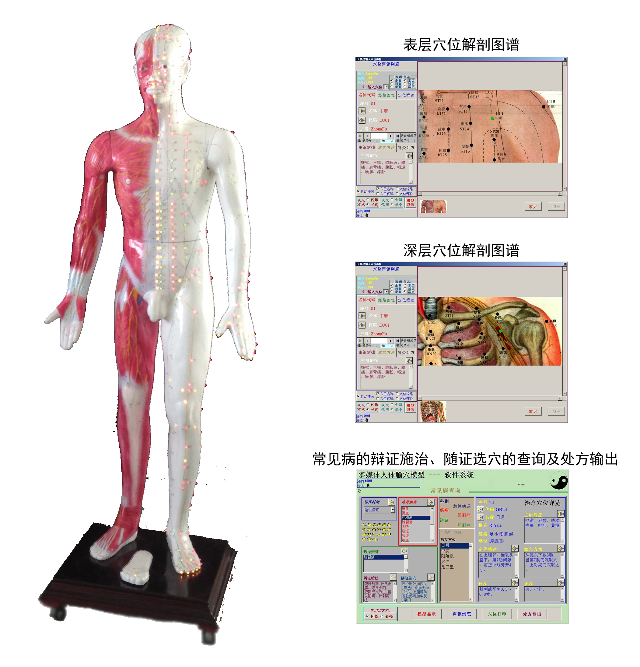 多媒體人體針灸穴位發(fā)光模型融計算機技術(shù)、電子控制技術(shù)、多媒體技術(shù)、腧穴理論于一體;聲音、屏幕、人體模型同步控制經(jīng)絡(luò)腧穴的信息;顯示十二經(jīng)脈循環(huán)流注,經(jīng)脈絡(luò)屬表里對經(jīng)關(guān)系,特定穴的分布;加之屏幕表層、淺層、深層穴位解剖圖譜的配合,常見病的辯證施治、隨證選穴的查詢及處方輸出,使學員對人體經(jīng)絡(luò)腧穴信息有更全方位的了解,更利于加深印象與理解掌握;同時,亦可用于臨床與科研參考;